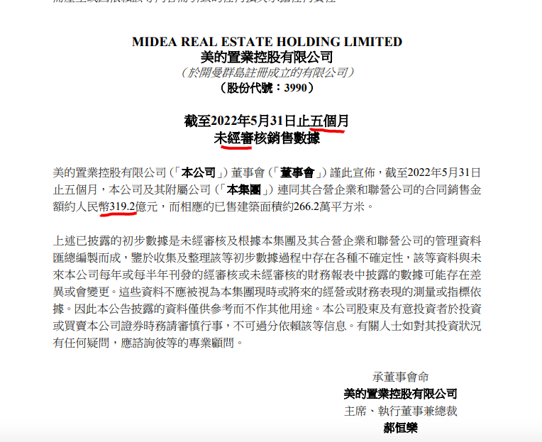 中華網(wǎng)財經(jīng)6月13日訊:美的置業(yè)控股有限公司(簡稱:美的置業(yè),3990.HK)發(fā)布截至2022年5月31日止五個月未經(jīng)審核銷售數(shù)據(jù)顯示,截至2022年5月31日止五個月,美的置業(yè)公司及其附屬公司連同其合營企業(yè)和聯(lián)營公司的合同銷售金額約人民幣319.2億元,同比下降53.8%;而相應的已售建筑面積約266.2萬平方米。